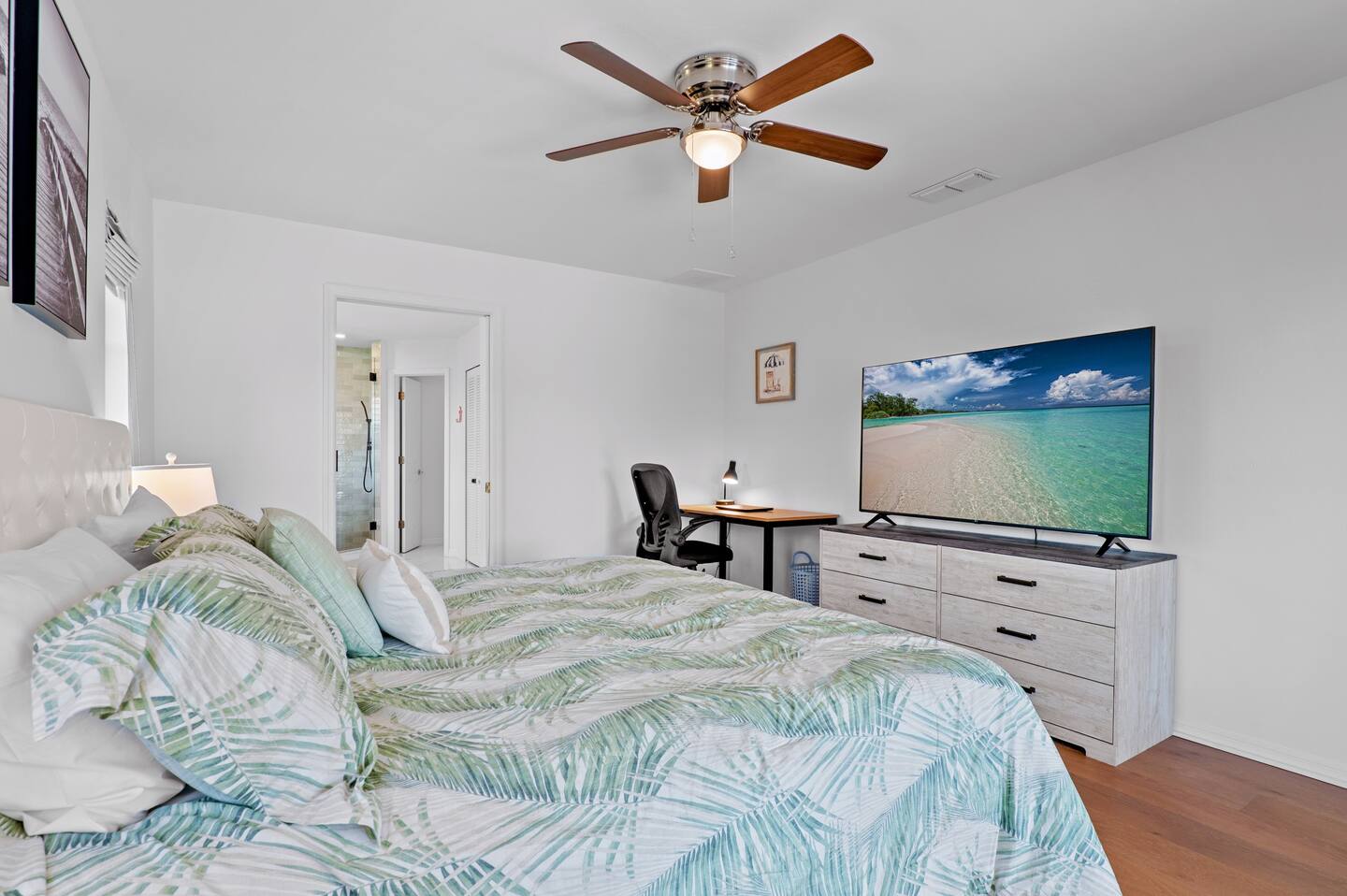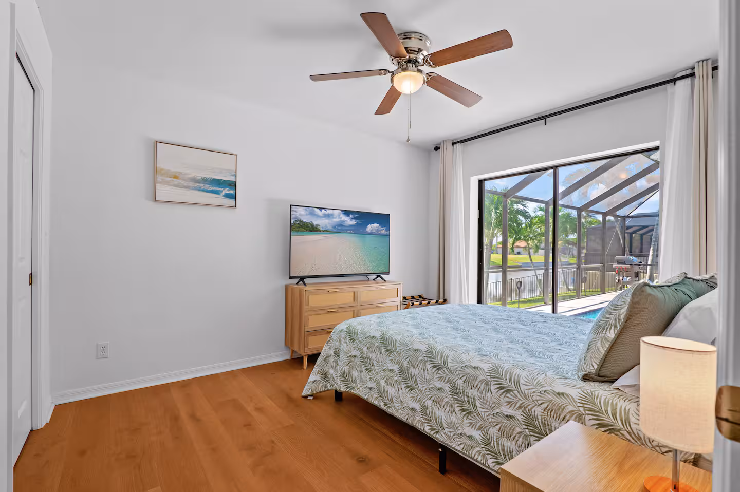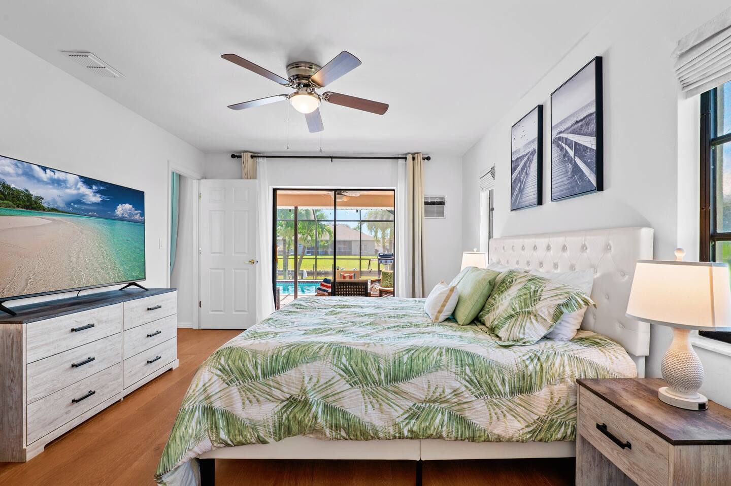 *Bedroom 1: Primary bedroom featuring a King bed, ensuite master bathroom, TV, sliding doors overlooking the pool and canal, large walk-in closet, dresser and dedicated workspace.