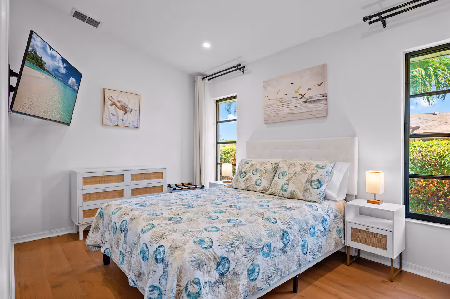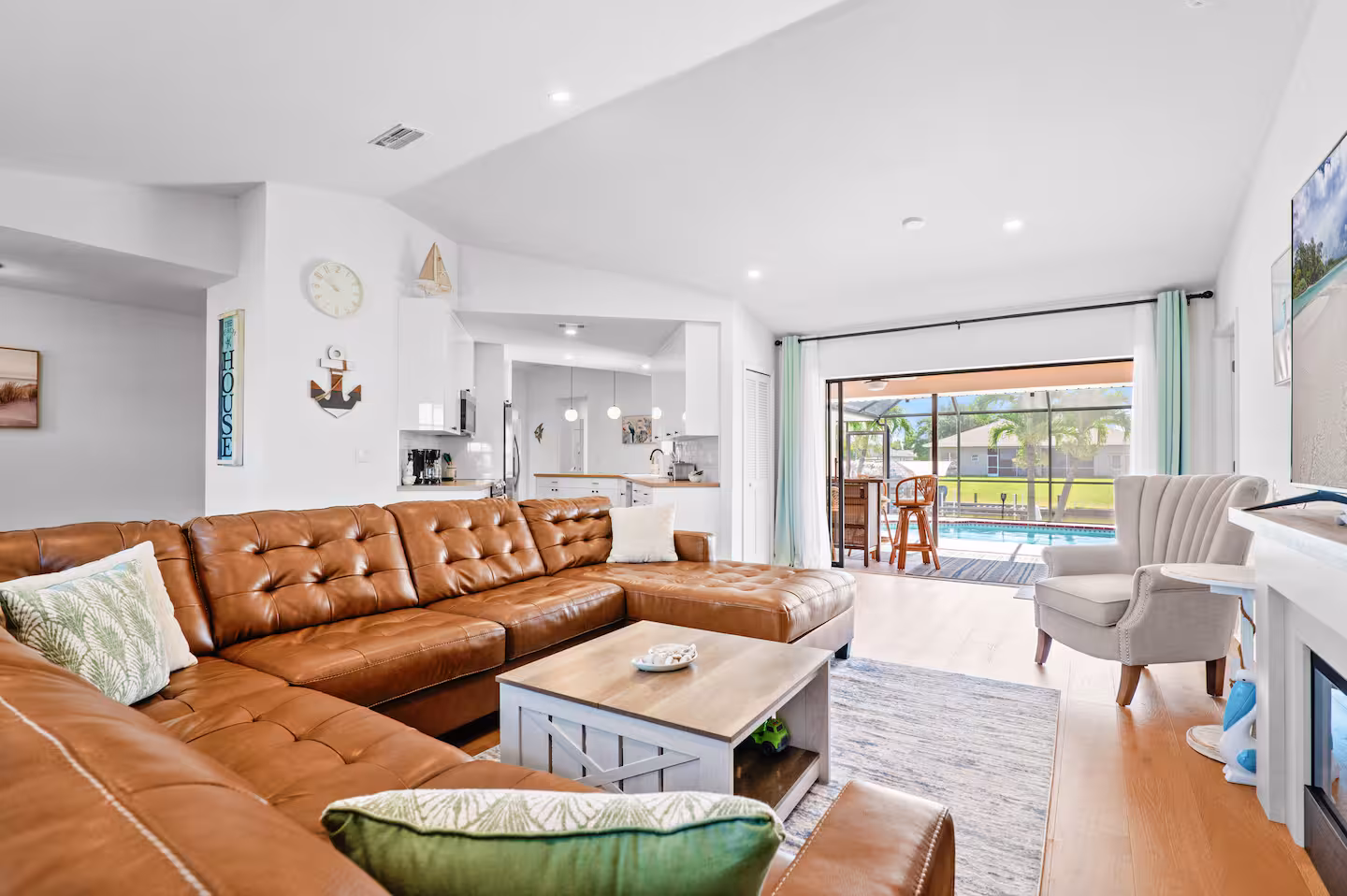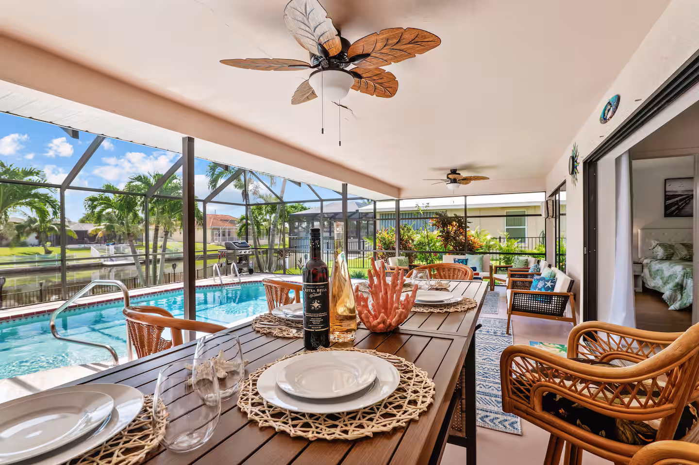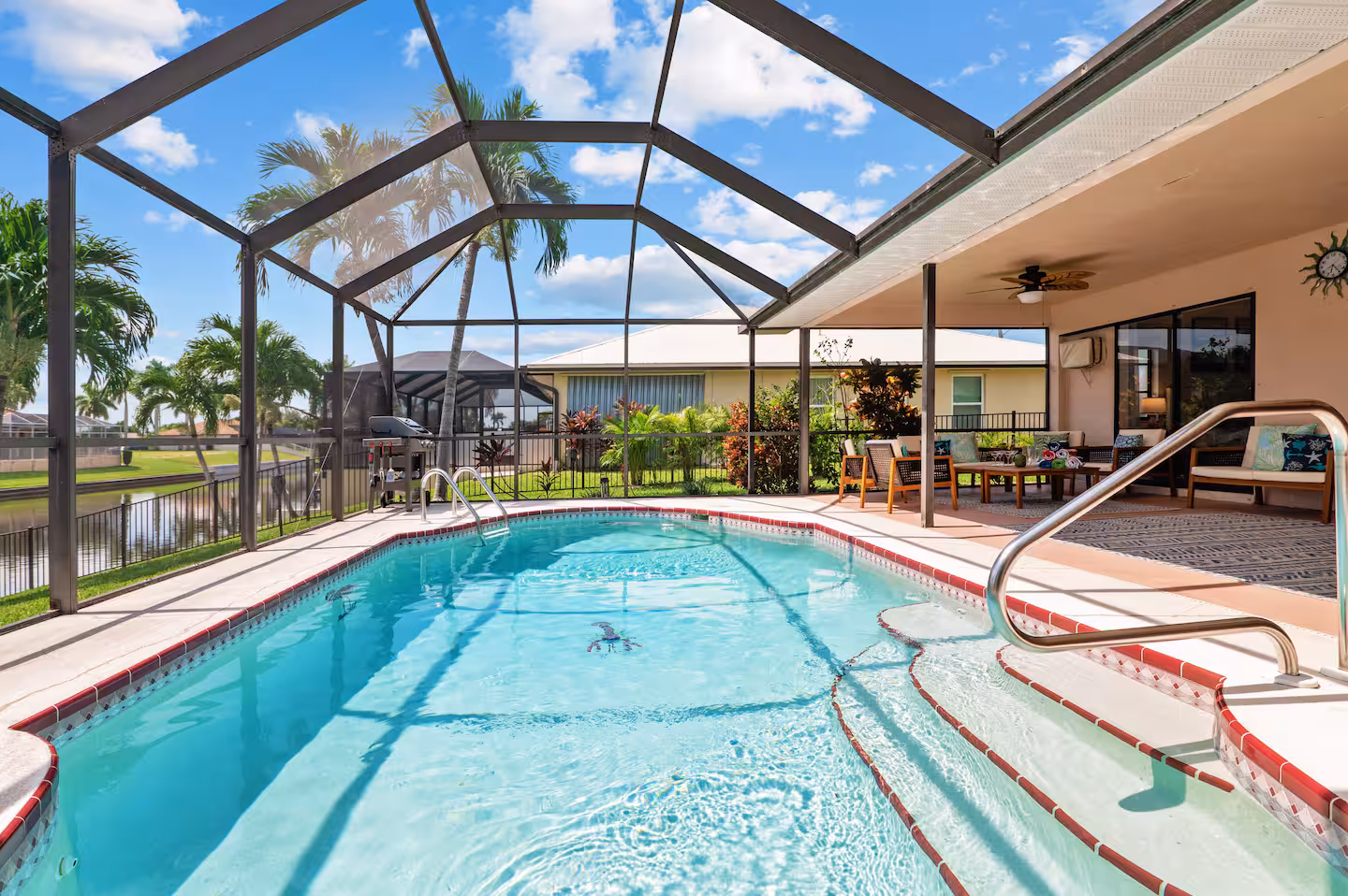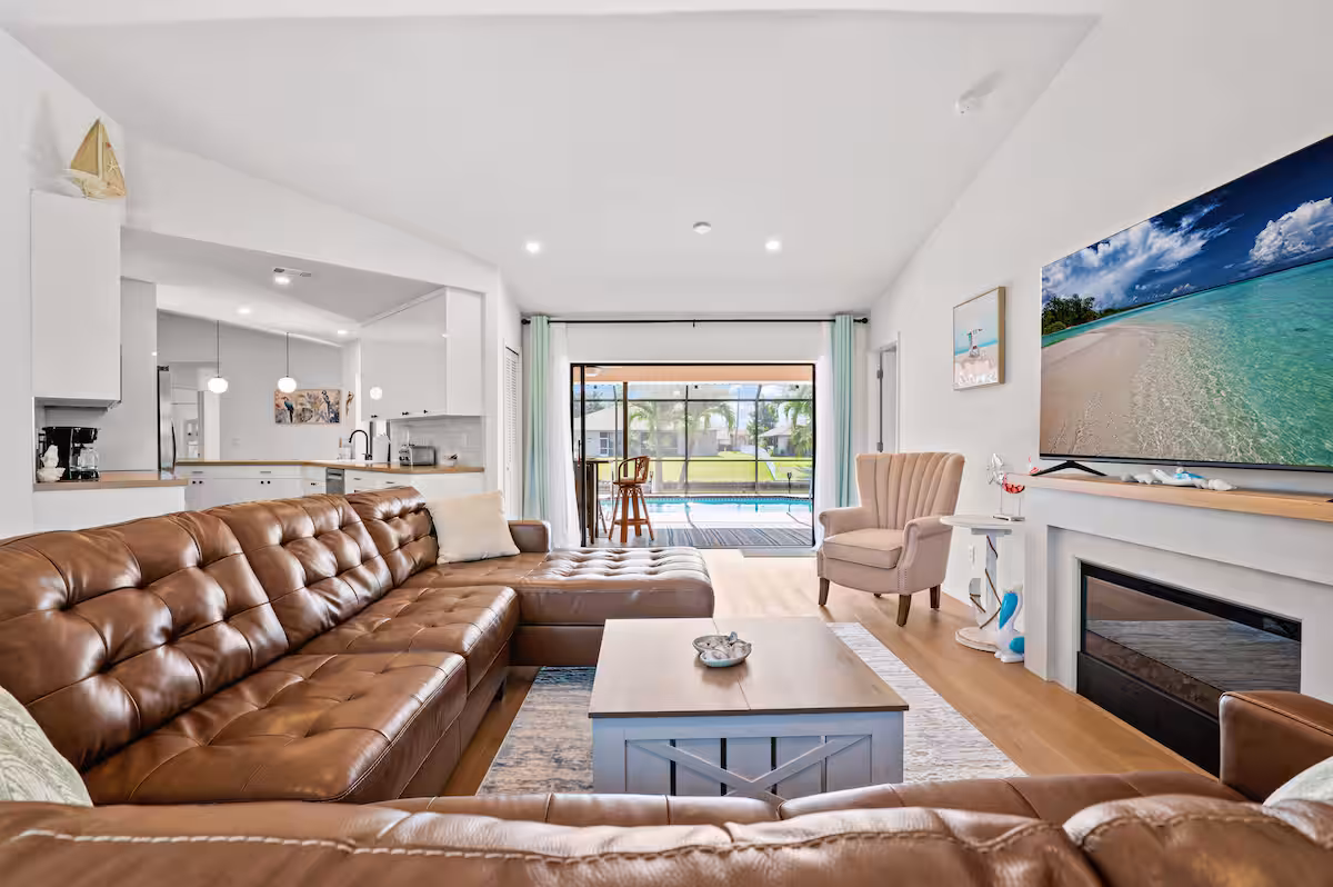 Located on a wide canal in Southwest Cape, Pelican Paradise is close to downtown Cape Coral, the Cape Coral Yacht Club + beach, Fort Myers and just a short drive to the gulf beaches. You’ll find everything you need for a comfortable and stylish stay, including modern amenities, comfortable beds, a fully stocked kitchen, and more.